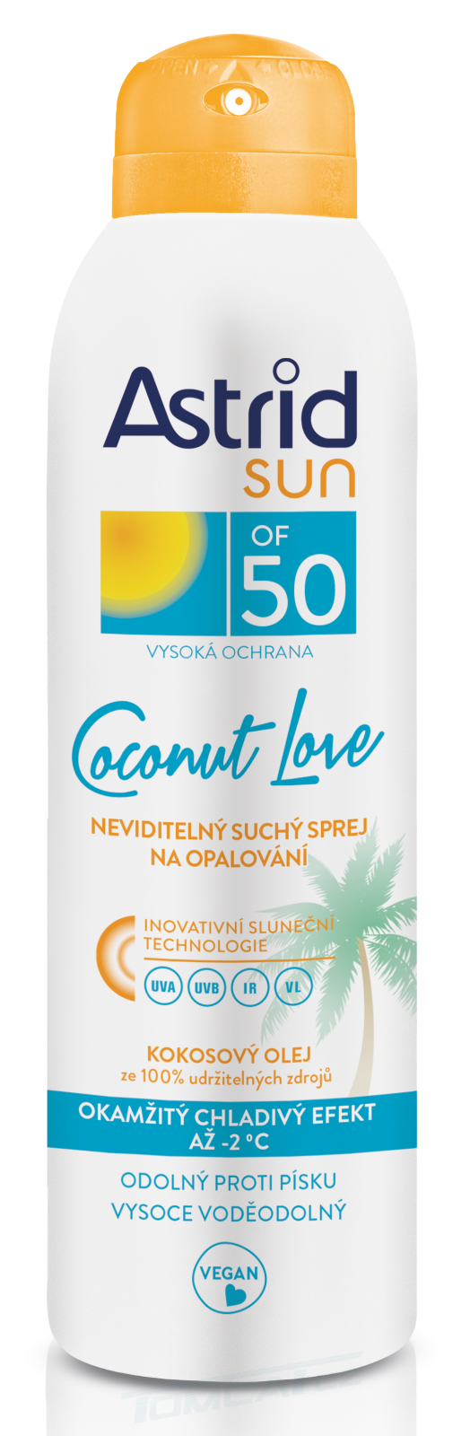 ASTRID SUN Neviditelný suchý sprej na opalování COCONUT LOVE OF 50 s inovativní sluneční technologií (UVA/UVB/IR/VL) poskytuje pokožce širokospektrální fotostabilní ochranu před škodlivými vlivy UV a infračerveného záření a viditelného světla.