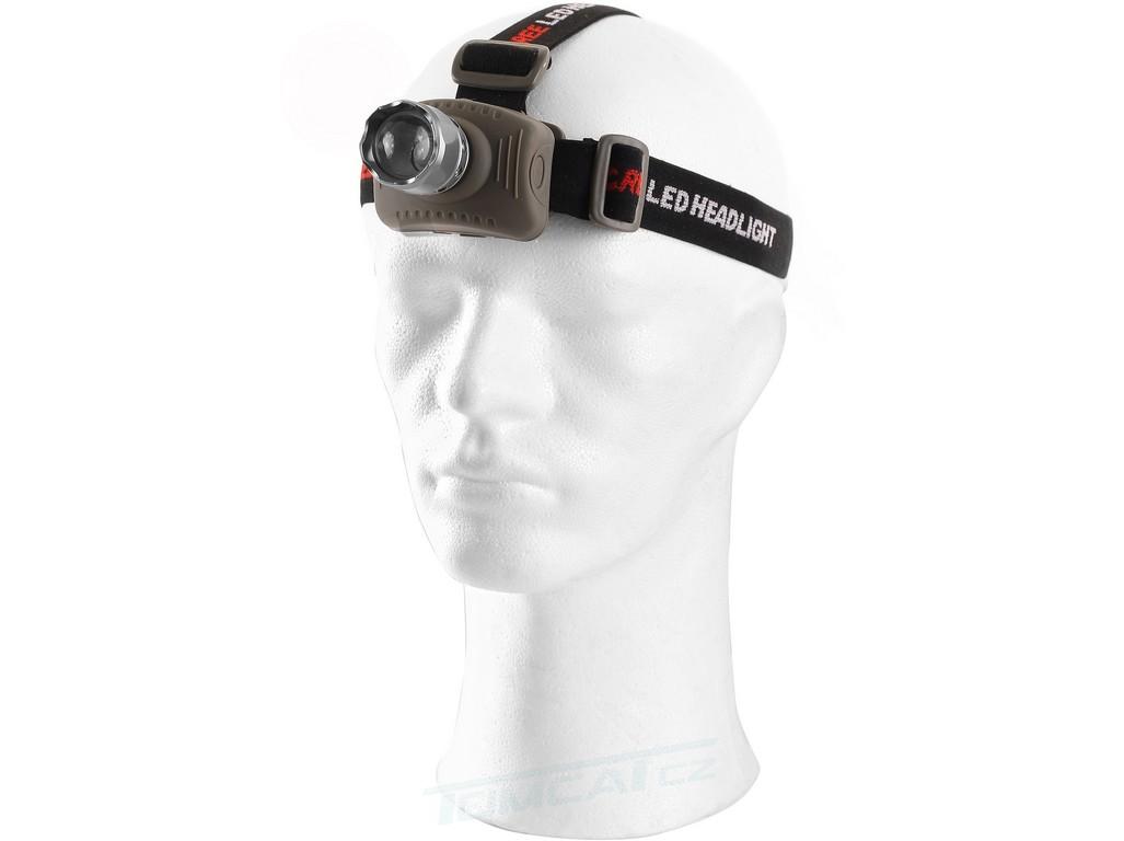 Čelová svítilna, světelný tok 120 lm, zdroj světla: 3W LED měnitelný fokus, možnost přepínání: 50 % - 100 % svícení + režim blikání, napájení 3xAAA (baterie nejsou součástí balení), doba svícení: až 42 hodin.