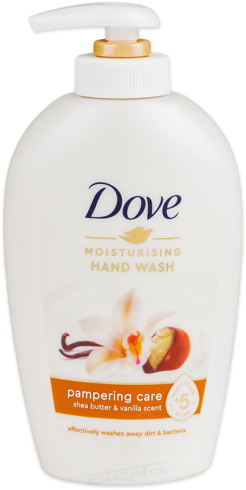 DOVE krémové tekuté mýdlo Shea Butter&Vanilla 250 ml, s bambuckým máslem a vůní vanilky a 1/4 hydratačního krému šetrně myje ruce a tělo, zanechává pokožku vyživenou.