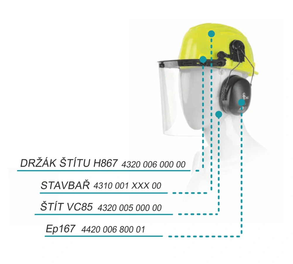 - možnost kombinace s držáky štítů, obličejovými štíty, mušlovými chrániči sluchu, podbradními pásky a potními pásky