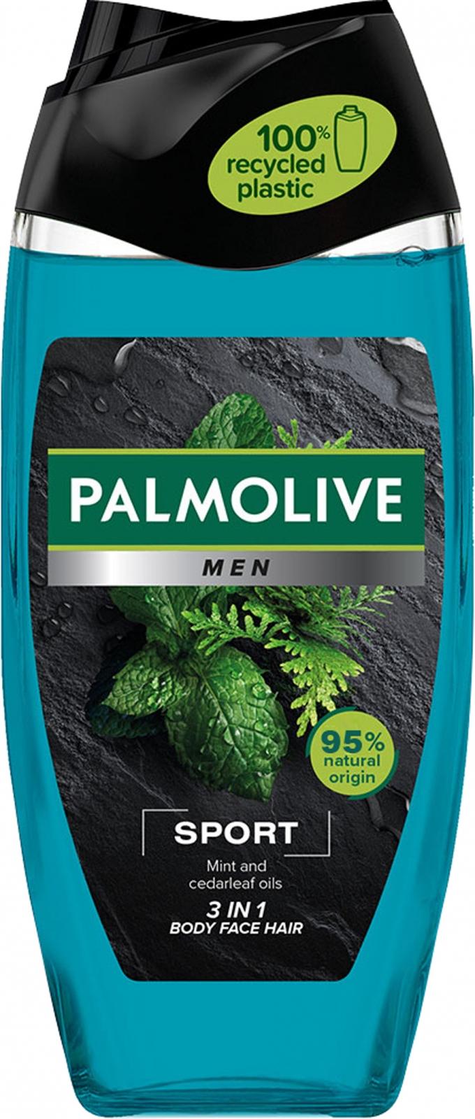 Sprchový gel PALMOLIVE For Men Sport 3v1 250 ml, příval svěží energie pro tělo a mysl, obohacený o mátu a olej z cedrových listů, dermatologicky testováno.